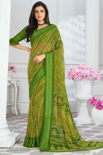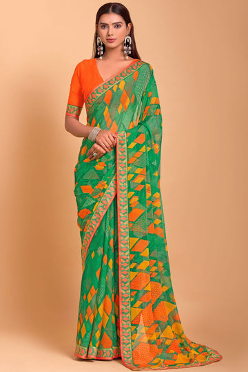 Saree color - Kelly green. Fabric - Georgette. Work/Pattern - Digital print with border work....