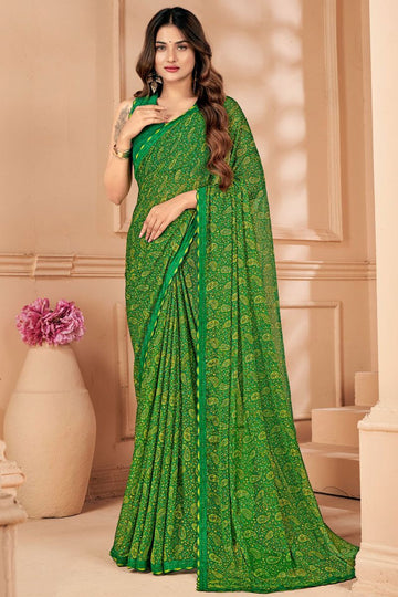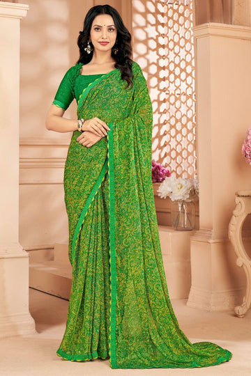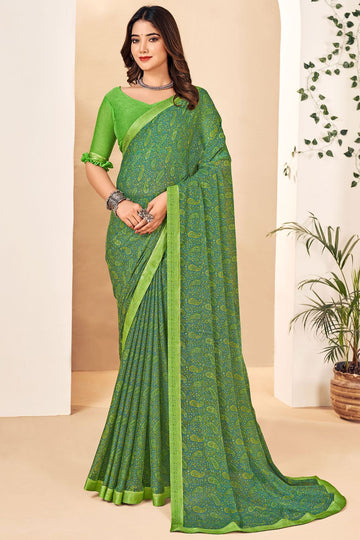 Saree color - Kelly green. Fabric - Chiffon. Work/Pattern - Printed with banarasi lace border....