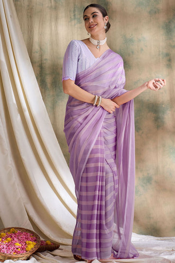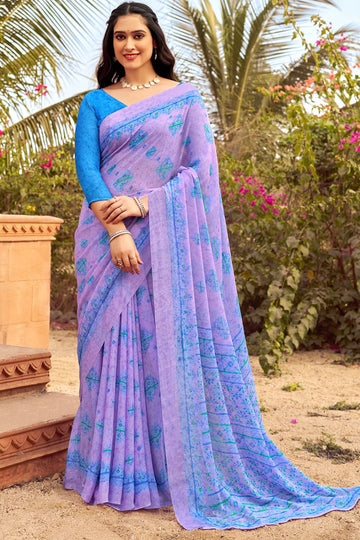 Saree color - Lavender. Fabric - Chiffon. Work/Pattern - Digital print. Blouse Color - Lavender....