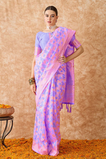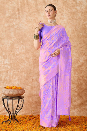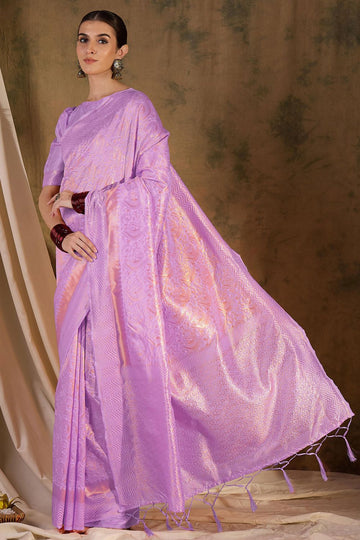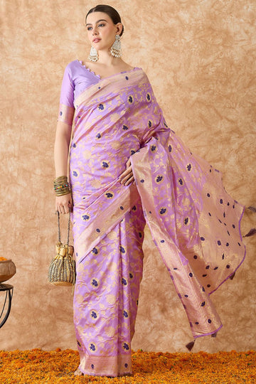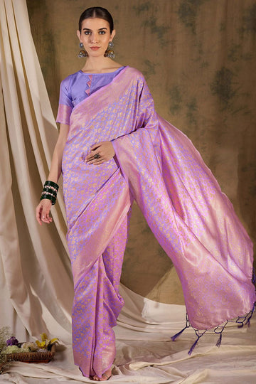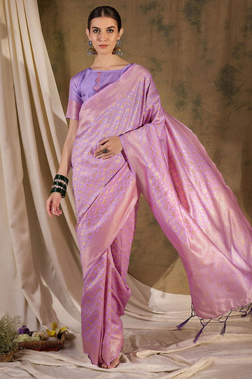 Saree color - Lavender. Fabric - Banarasi silk. Work/Pattern - Zari weaving with stylish tassels...