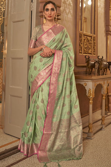 Saree color - Parrot green. Fabric - Two tone silk. Work/Pattern - Handloom weaving. Saree...