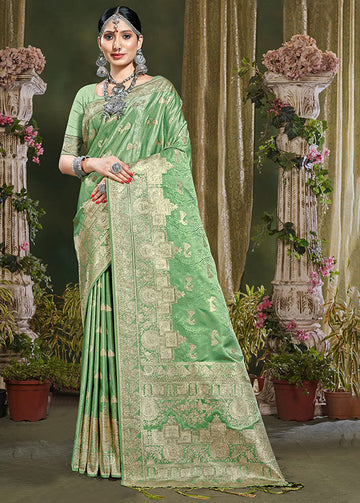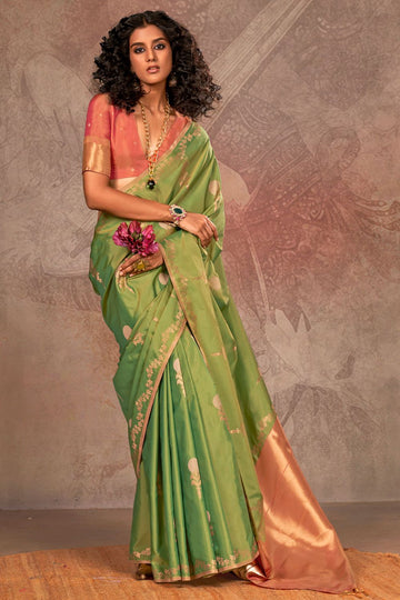 Saree color - Parrot green. Fabric - Banarasi silk. Work/Pattern - Weaving. Blouse Color -...