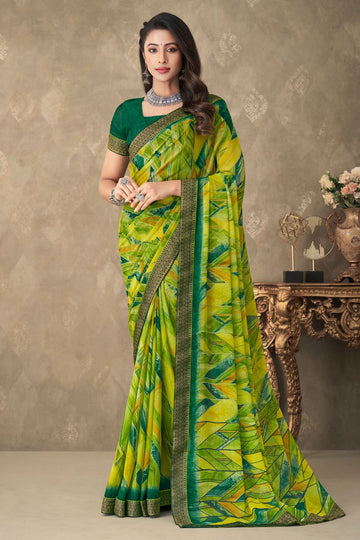 Saree color - Parrot green. Fabric - Chiffon. Work/Pattern - Printed. Blouse Color - Parrot...
