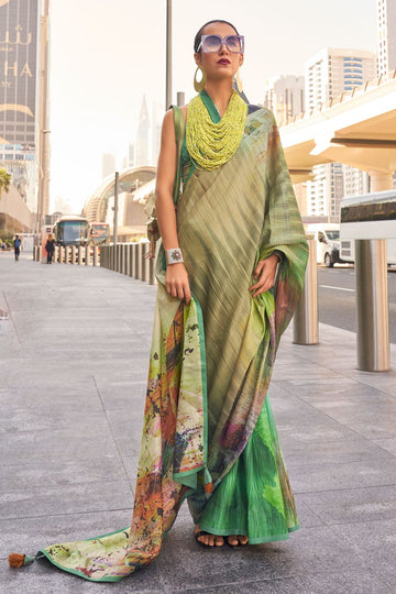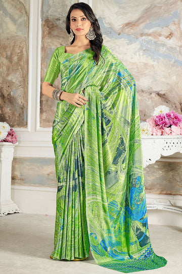 Saree color - Parrot green. Fabric - Silk crepe. Work/Pattern - Digital print. Blouse Color...