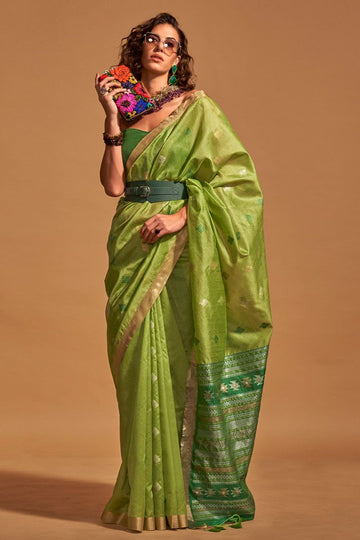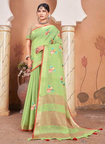 Saree color - Parrot green. Fabric - Linen. Work/Pattern - Weaving. Blouse Color - Parrot...