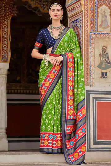 Saree color - Parrot green. Fabric - Sigma silk. Work/Pattern - Mercerized with aqua finish...