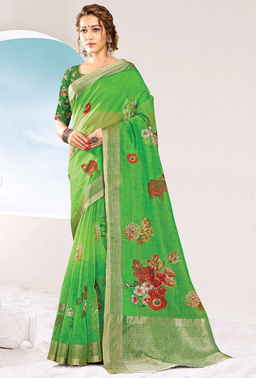 Saree color - Parrot green. Fabric - Organza silk. Work/Pattern - Floral print and pallu...