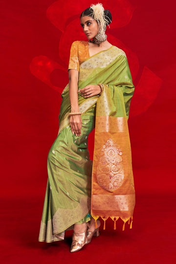 Saree color - Parrot green. Fabric - Silk. Work/Pattern - Zari weaving with tassles on...