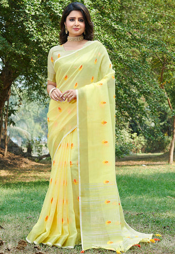Saree color - Pastel yellow. Fabric - Linen. Work/Pattern - Printed butti with tassles on...