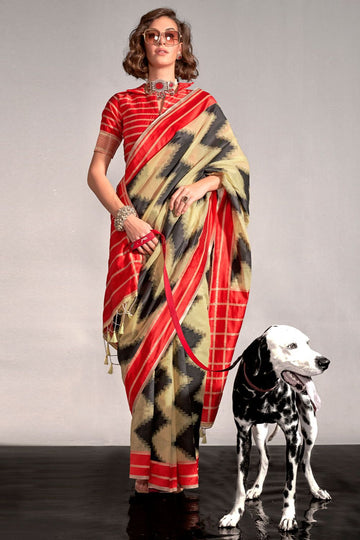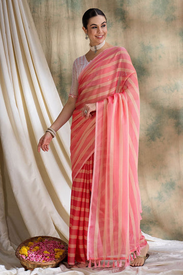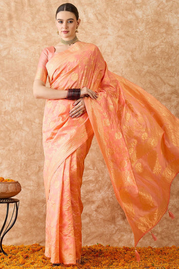 Saree color - Peach. Fabric - Cotton jacquard. Work/Pattern - Zari weaving with stylish tassels...