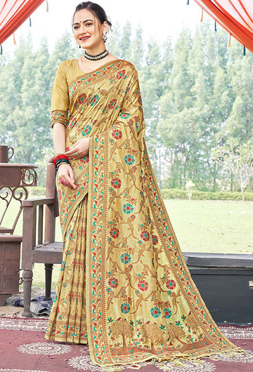 Saree color - Pastel yellow. Fabric - Zari tissue. Work/Pattern - Hand weaving. Saree Length...