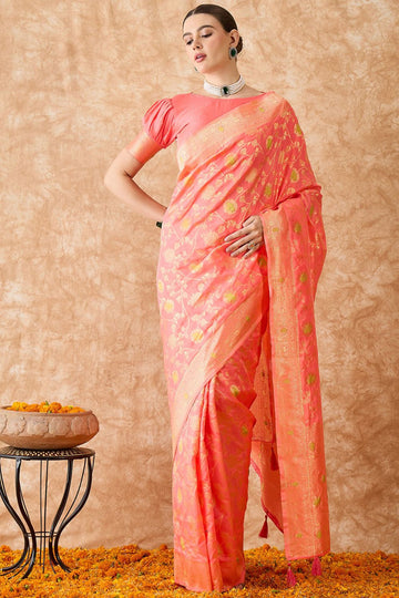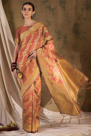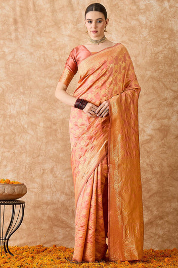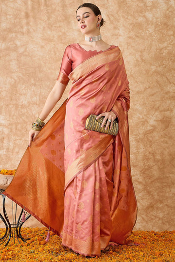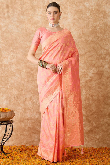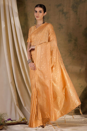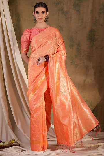 Saree color - Peach. Fabric - Banarasi silk. Work/Pattern - Zari weaving with stylish tassels...