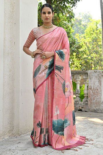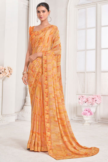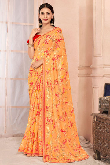 Saree color - Peach. Fabric - Chiffon. Work/Pattern - Digital printed with lace border work....