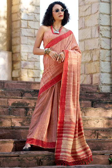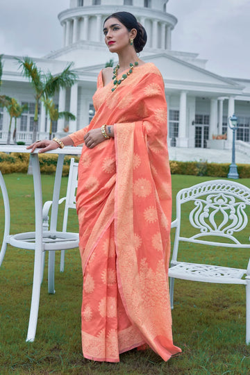Saree color - Peach. Fabric - Jacquard khadi organza. Work/Pattern - Weaving work. Saree Length...