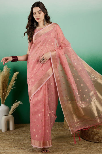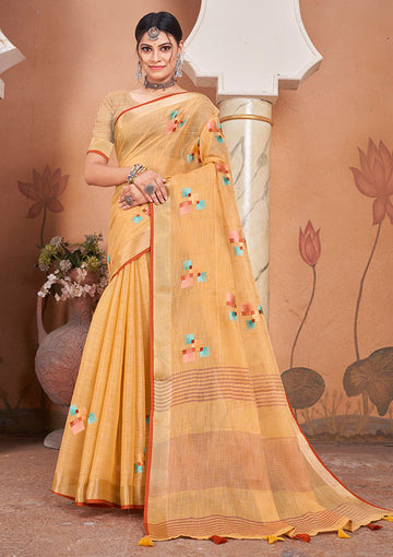 Saree color - Peach. Fabric - Linen. Work/Pattern - Weaving. Blouse Color - Peach. Saree...