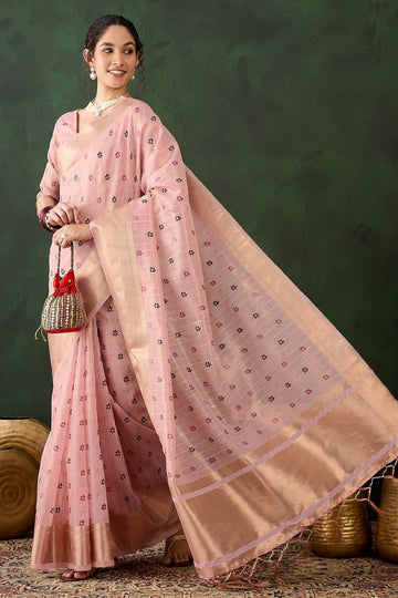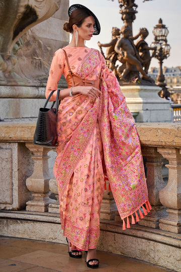 Saree color - Peach. Fabric - Organza handloom. Work/Pattern - Organza parsi handloom weaving. Saree...