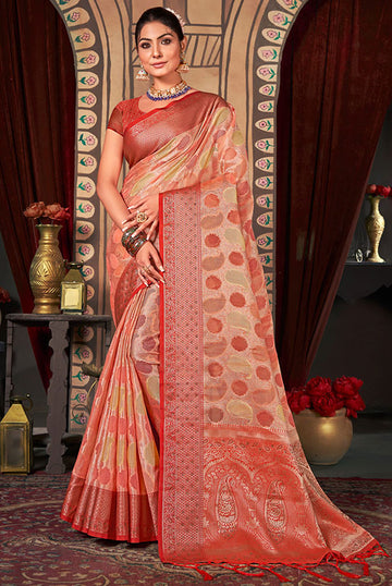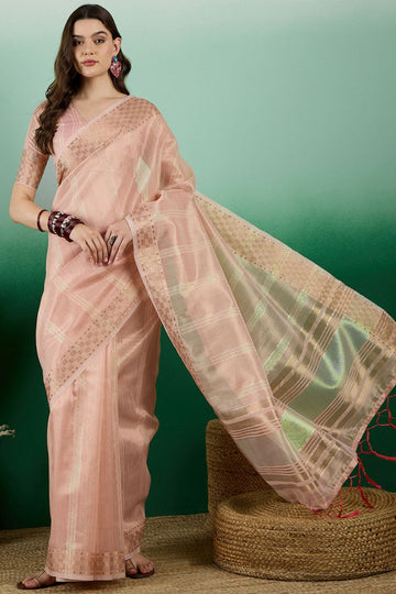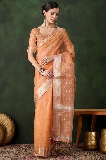 Saree color - Peach. Fabric - Organza. Work/Pattern - Weaving. Saree Length - 5.50 Meters....