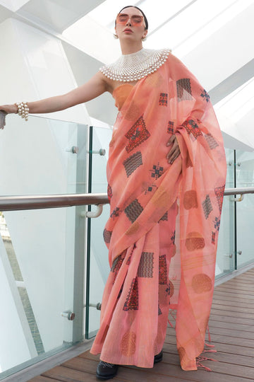 Saree color - Peach orange. Fabric - Pure linen. Work/Pattern - Weaving work. Saree Length...