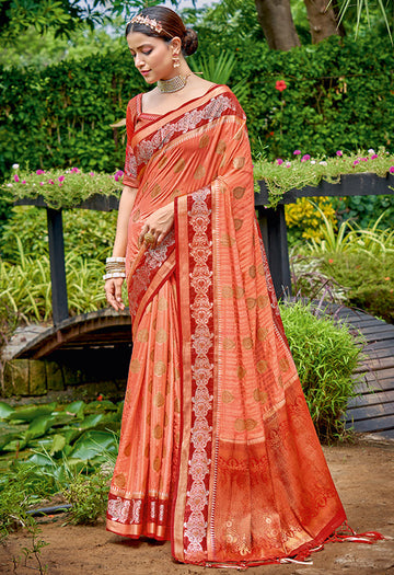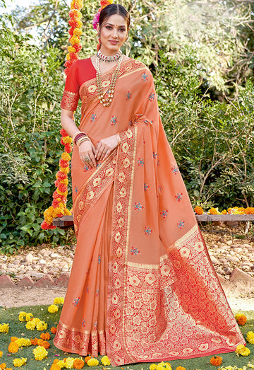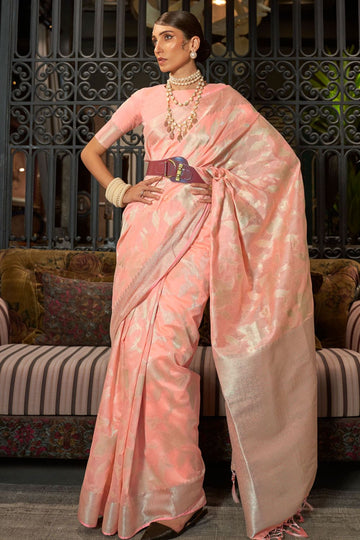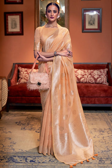 Saree color - Peach. Fabric - Banarasi silk. Work/Pattern - Weaving. Blouse Color - Peach....