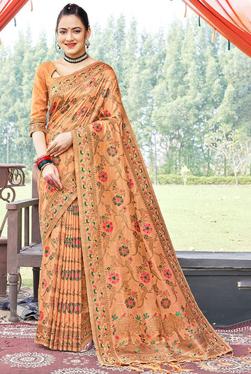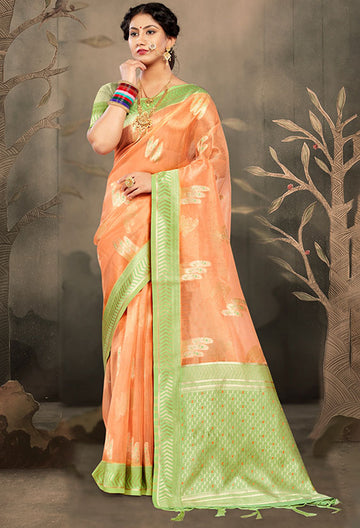 Saree color - Peach. Fabric - Tissue zari organza. Work/Pattern - Weaving work. Saree Length...