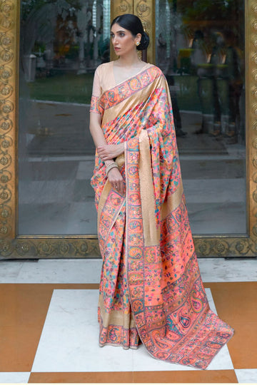 Saree color - Peach. Fabric - Kashmiri modal handloom weaving. Work/Pattern - Kashmiri weaving work....