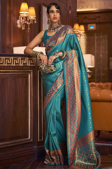 Saree color - Peacock blue. Fabric - Kanjivaram Raw silk. Work/Pattern - Weaving. Saree Length...