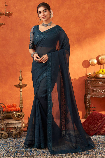Saree color - Peacock blue. Fabric - Chiffon. Work/Pattern - Embroidered. Saree Length - 5.50...