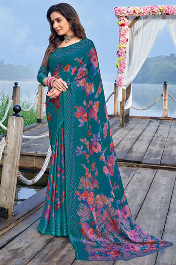 Saree color - Peacock blue. Fabric - Chiffon. Work/Pattern - Digital print. Saree Length -...