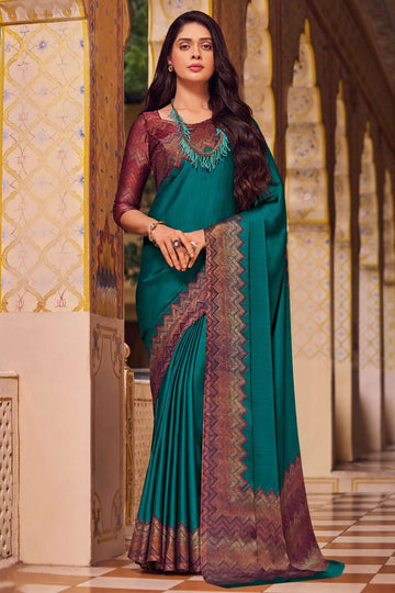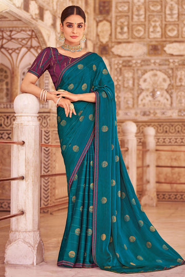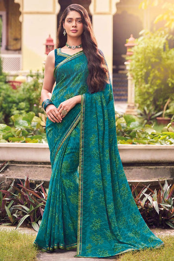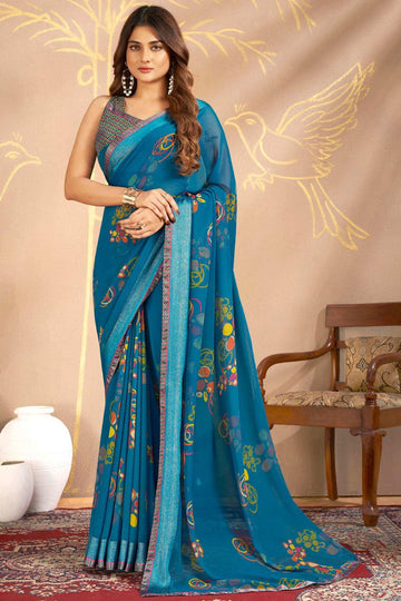 Saree color - Peacock blue. Fabric - Chiffon. Work/Pattern - Printed border with printed blouse....