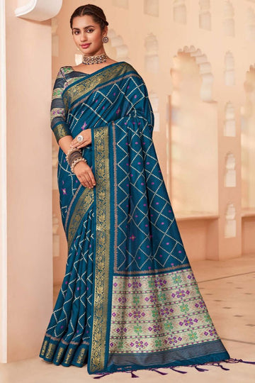 Saree color - Peacock blue. Fabric - Silk. Work/Pattern - Foil print with tassles on...