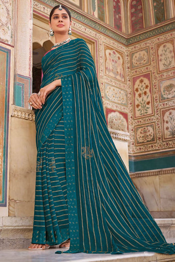 Saree color - Peacock blue. Fabric - Georgette. Work/Pattern - Printed with lace border. Blouse...