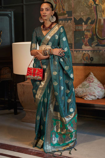 Saree color - Peacock blue. Fabric - Satin silk. Work/Pattern - Weaving work with tassles...