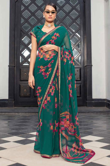 Saree color - Peacock green. Fabric - Georgette. Work/Pattern - Printed with lace border. Blouse...