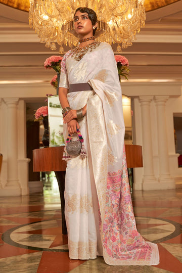 Saree color - Pearl white. Fabric - Modal. Work/Pattern - Kashmiri pallu with handloom weaving...