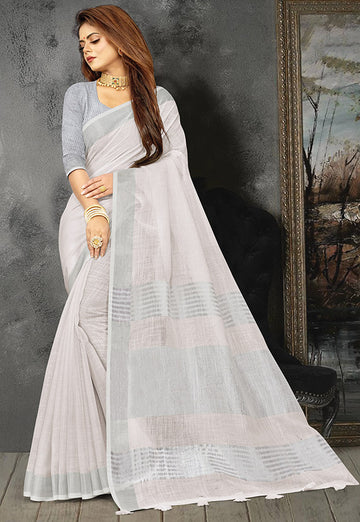 Saree color - Pearl white. Fabric - Linen. Work/Pattern - Stripes print with tassles on...
