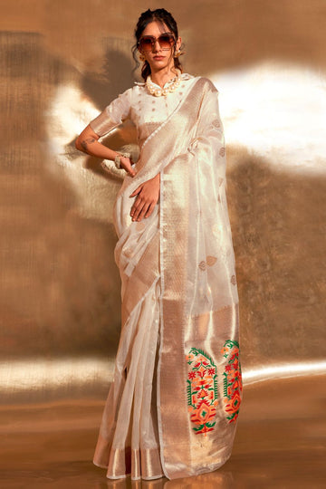 Saree color - Pearl white. Fabric - Zari tissue with paithani pallu. Work/Pattern - Weaving....
