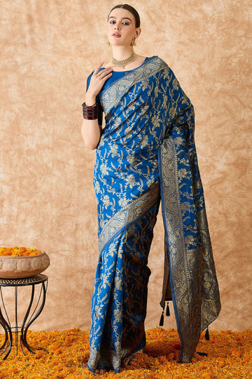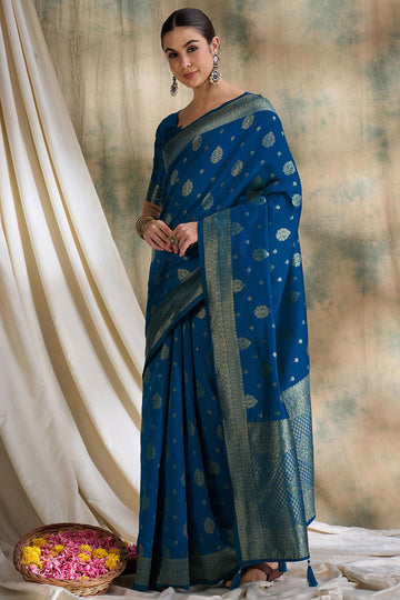 Saree color - Petrol blue. Fabric - Banarasi silk. Work/Pattern - Zari weaving with stylish...