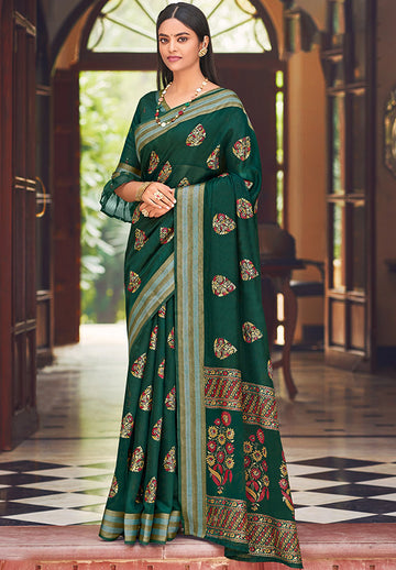 Saree color - Pine green. Fabric - Chanderi. Work/Pattern - Printed. Blouse Color - Pine...