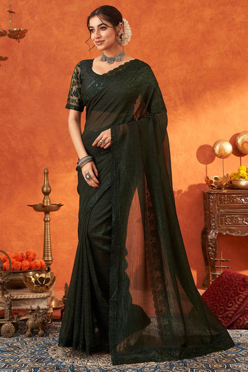 Saree color - Pine green. Fabric - Chiffon silk. Work/Pattern - Embroidered patch border. Saree...