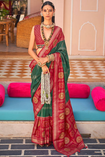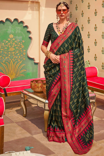Saree color - Pine green. Fabric - PV silk. Work/Pattern - Patola design foil print...