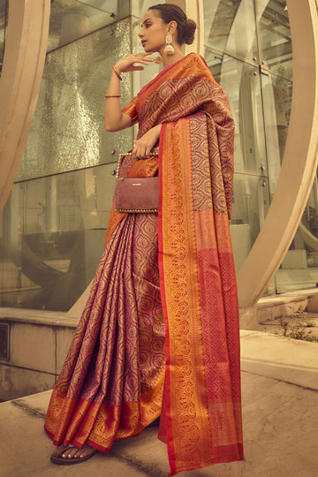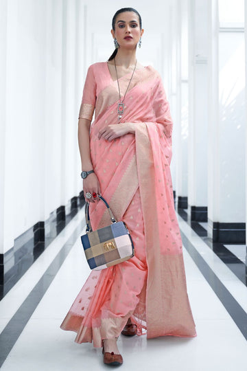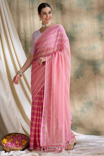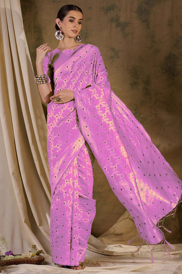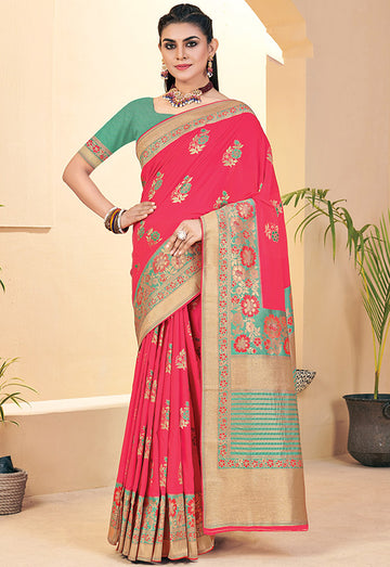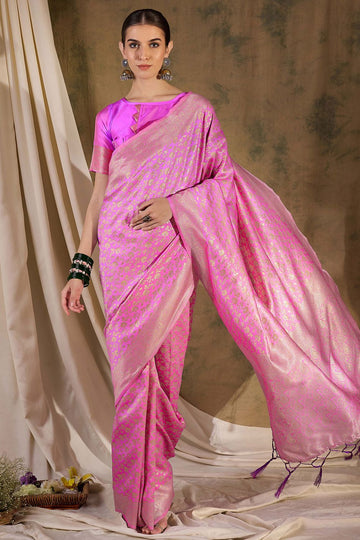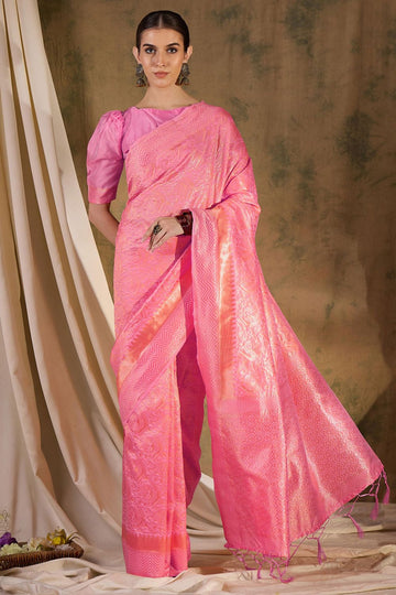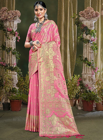 Saree color - Pink. Fabric - Banarasi silk. Work/Pattern - Weaving. Blouse Color - Pink....