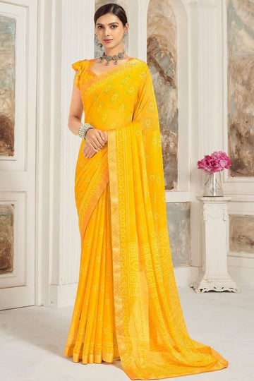 Saree color - Pineapple yellow. Fabric - Chiffon. Work/Pattern - Printed with attached border. Blouse...