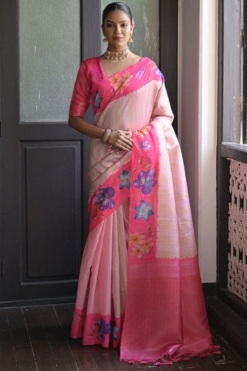 Saree color - Pink. Fabric - Poly brasso handloom. Work/Pattern - Printed with handloom weaving...