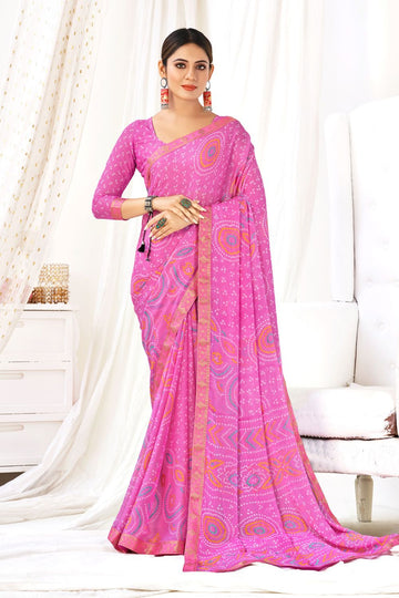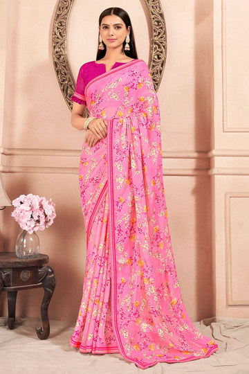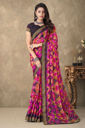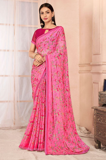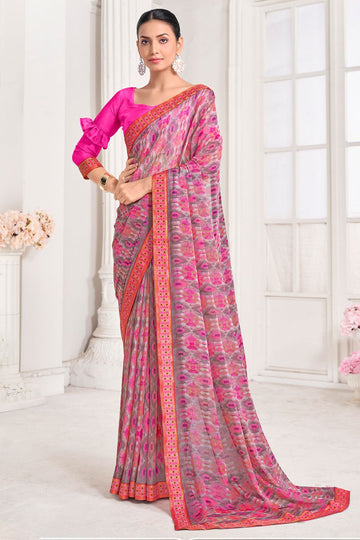 Saree color - Pink. Fabric - Chiffon. Work/Pattern - Digital printed with lace border work....