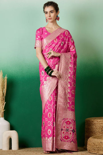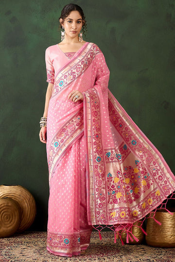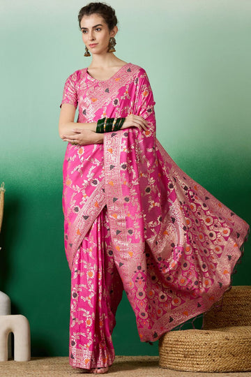 Saree color - Pink. Fabric - Staple dola jacquard.. Work/Pattern - Weaving work. Saree Length...