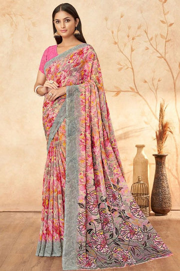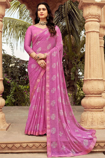 Saree color - Pink. Fabric - Chiffon. Work/Pattern - Printed with patch border. Blouse Color...