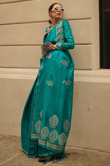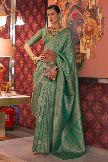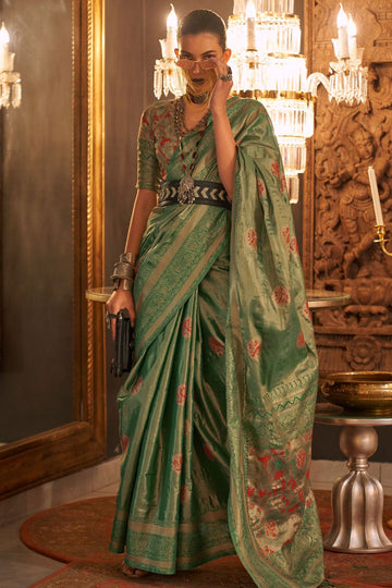 Saree color - Rama green. Fabric - Two tone silk. Work/Pattern - Multi zari handloom...