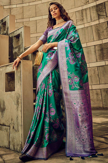 Saree color - Rama green. Fabric - Satin. Work/Pattern - Zari handloom weaving. Saree Length...