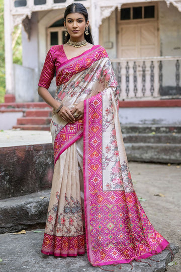 Saree color - Rani pink and beige. Fabric - Soft tussar silk. Work/Pattern - Printed...