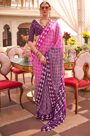 Saree color - Rani pink and wine. Fabric - Mercerized silk. Work/Pattern - Patola print....